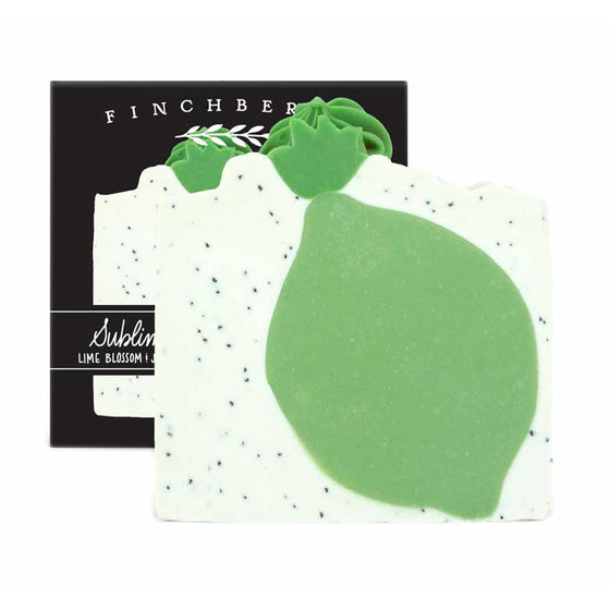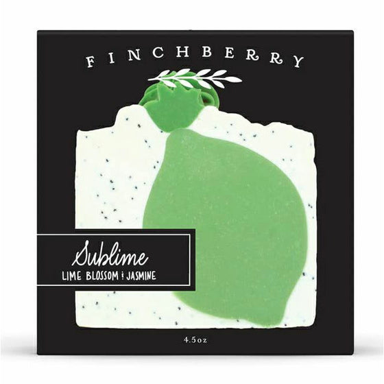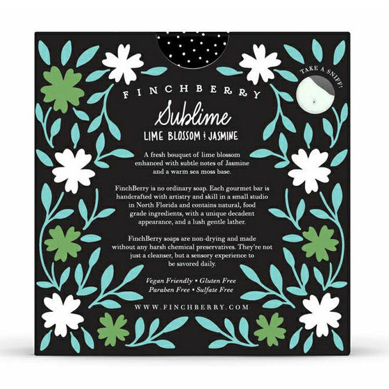 Finchberry 4.5oz Sublime (lime blossom & jasmine) all natural soap in box. Made in the USA. Soaps are vegan-friendly, gluten-free and preservative-free.