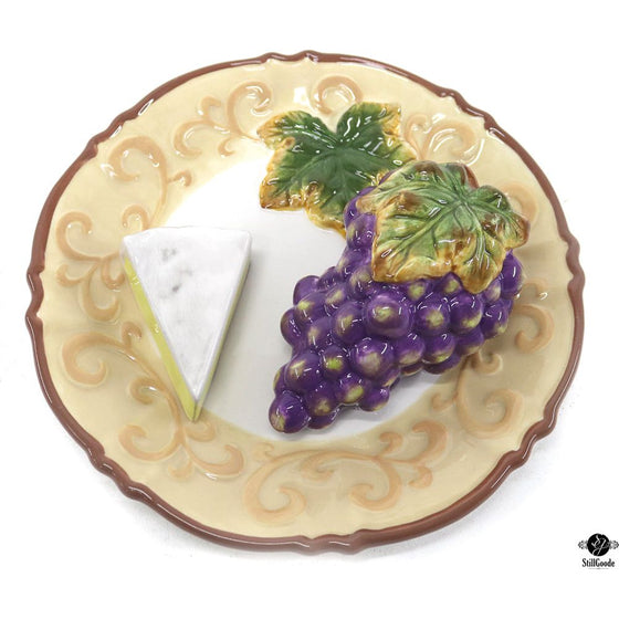 Glazed ceramic decorative plate in a grapes and cheese pattern from the 3D Collector Plates series by Baum Bros.