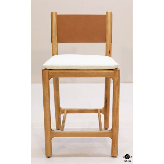 Denver Modern 'Avon' counter high barstool with cognac leather back, linen tone seat. Brand new on consignment by commercial consignor. Retail price $675.