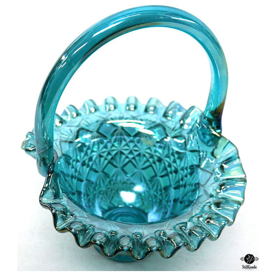 Starburst diamond iridescent glass basket with ruffled edge in a blue tone by Fenton.